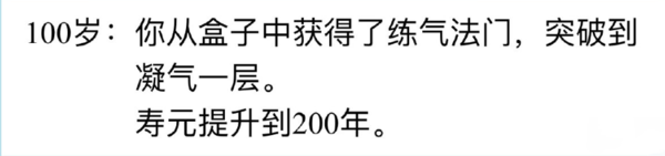 其实这个小盒子并不是每一次都可以获得的,只能看脸,就是每次重开之后有几率获得,神秘小盒子是用户们可以在100岁时开启,即可打开修仙历练之路的关键点所在。