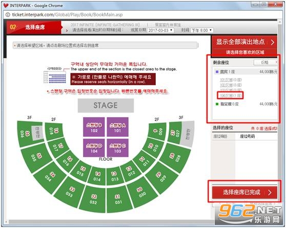 输入完就会进入座位图,直接点你要的区域。剩余情况在右上角点开就能看得到,如果事先不知道放了哪部分区域的票,建议直接点右边选择座位,防止点进未放票的区域浪费时间。(一般情况下不会出现这样的事,但我就被武林坑了…辣鸡公司不事先通知)此外,一般都会提前放出座位图预览,购票之前就要想好买哪区,开票再纠结肯定买不到,当然如果你家爱豆十八线一点也不red就当我没说。(被打死)如果想要的位置没了赶快换别的,手要快!