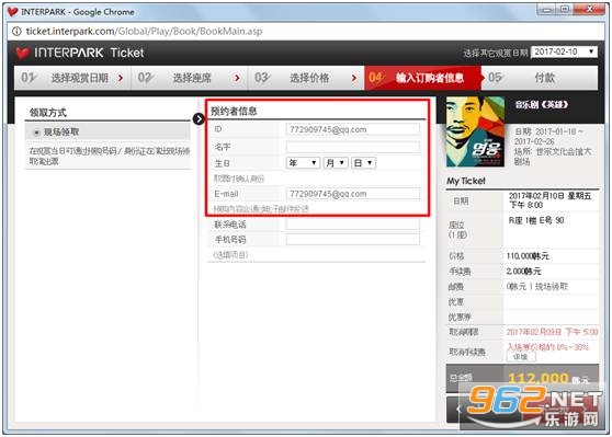 国外版默认演出当日现场领取,预约者姓名请填你护照上的英文名,注意空格也最好不要错,生日也一定要填对,不然可能会影响你取票!!!邮箱默认你注册时使用的,购票成功后会发送确认信到填写的邮箱。电话这里随便填两个数字,没有用(虽然写选填但事实上一定要填)最好事先在文档中打好,付款时可直接复制粘贴节省时间。